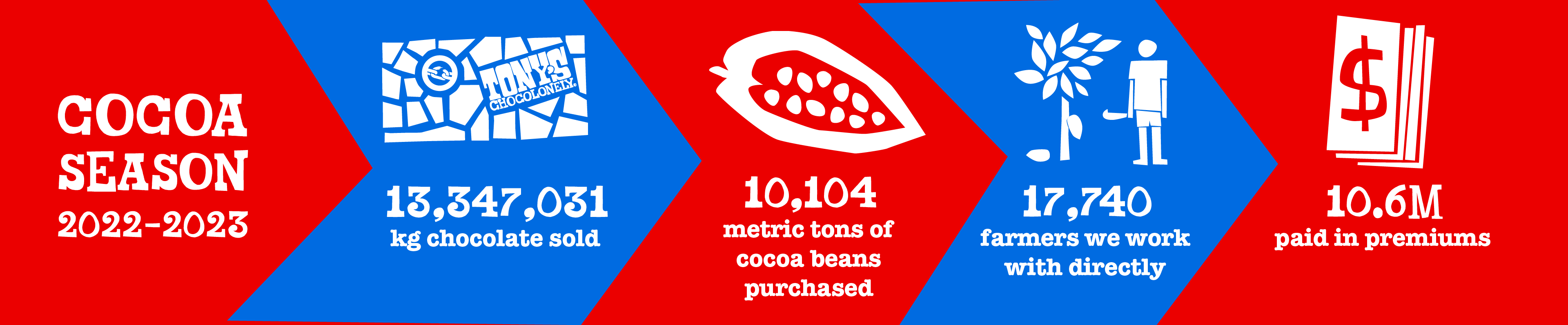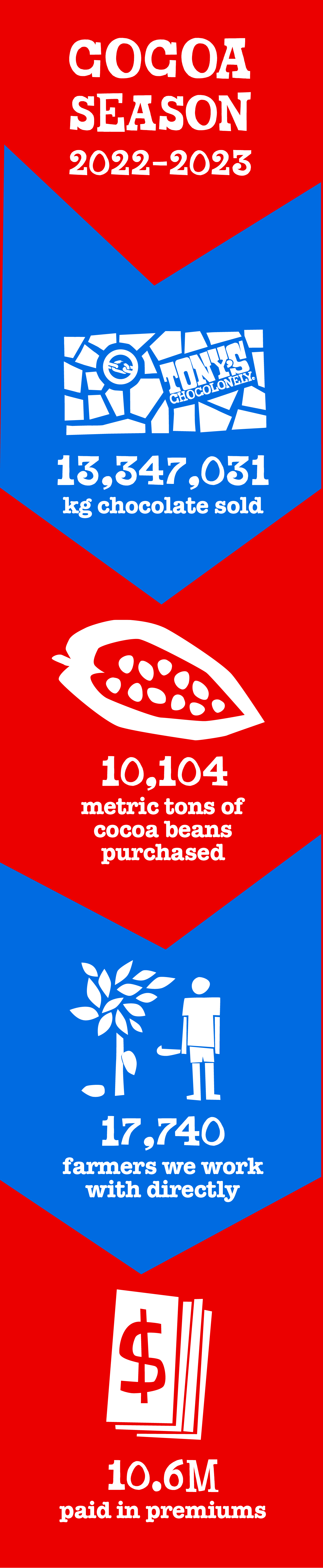 私たちのチョコレートを知る人が増えています。昨年度、当社は 1,334 万 7,031 kg のチョコレートを販売しました。成長は私たちの取り組みの重要な部分です。え?これにより、より公平なカカオサプライチェーンを実現するための実証済みの戦略から恩恵を受ける、より多くの農家と協力できるようになります。また、これは、私たちがチョコレート業界でもっと騒ぐことができ、チョコレート大手企業が私たちの例に倣うよう促すことを意味します。トニーの 5 つの調達原則に従って、トニーのオープン チェーン経由でカカオを調達するということです。